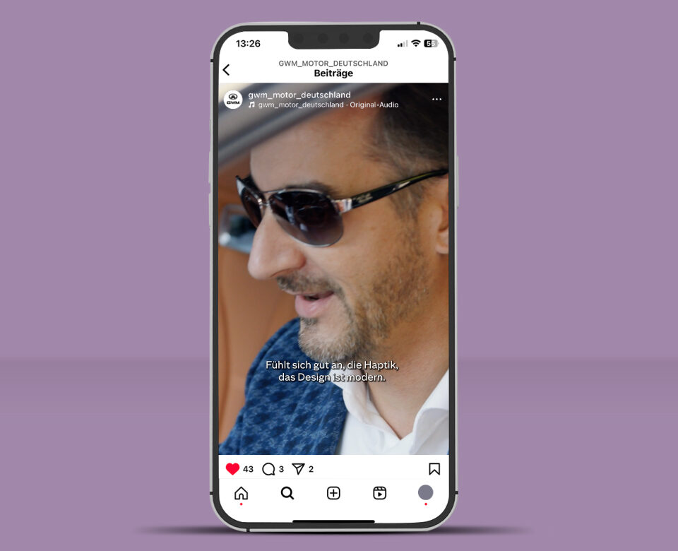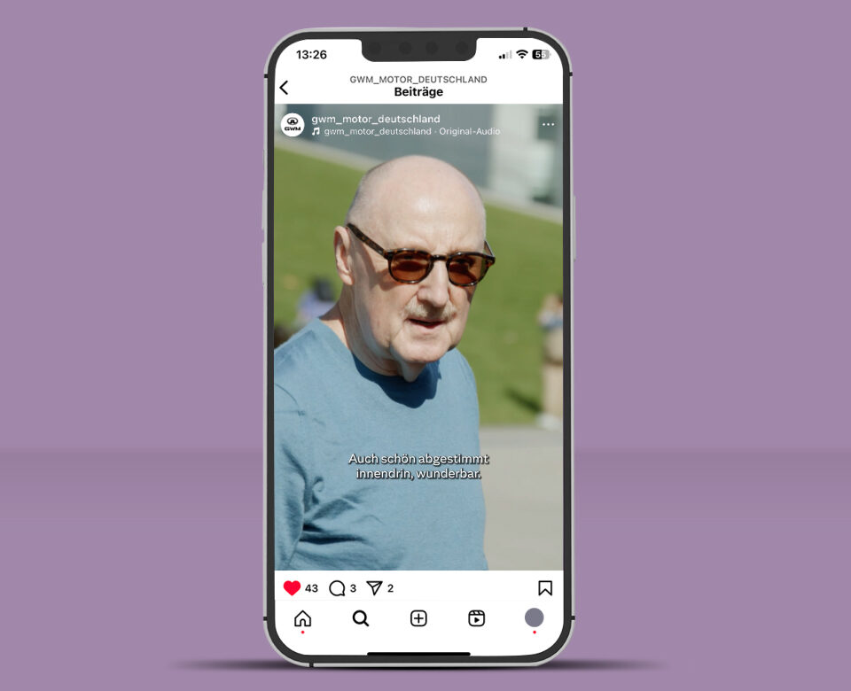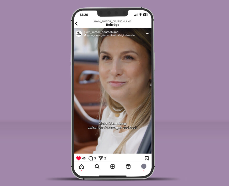 Wir wollten wissen: Stimmt das Design? Stimmt die Verarbeitung? Stimmt der Komfort? Und nicht: Stimmt die Marke? Deshalb haben wir den ORA 07 in die Düsseldorfer City gestellt, alle Logos entfernt und Passanten in das viertürige, vollelektrische Coupé eingeladen – zu einem ausführlichen Blind Date. Die Reaktionen haben wir gefilmt und daraus ein erstaunliches Stück Empfehlungswerbung gemacht, aufgearbeitet für die Landingpage und für Social Media.